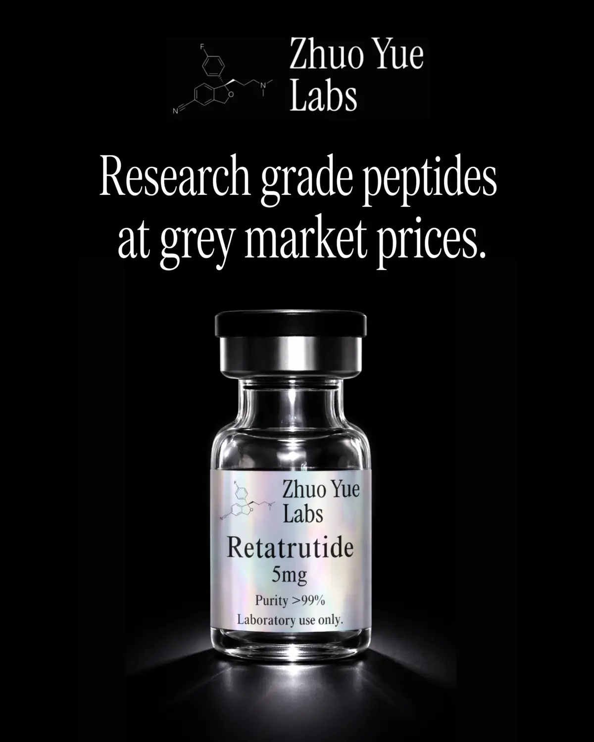 All products sold by Zhuo Yue Labs are intended strictly for laboratory research purposes only. They are not intended for human consumption, medical use, or diagnostic purposes. By purchasing, you acknowledge that these products have not been approved by the FDA for human use.